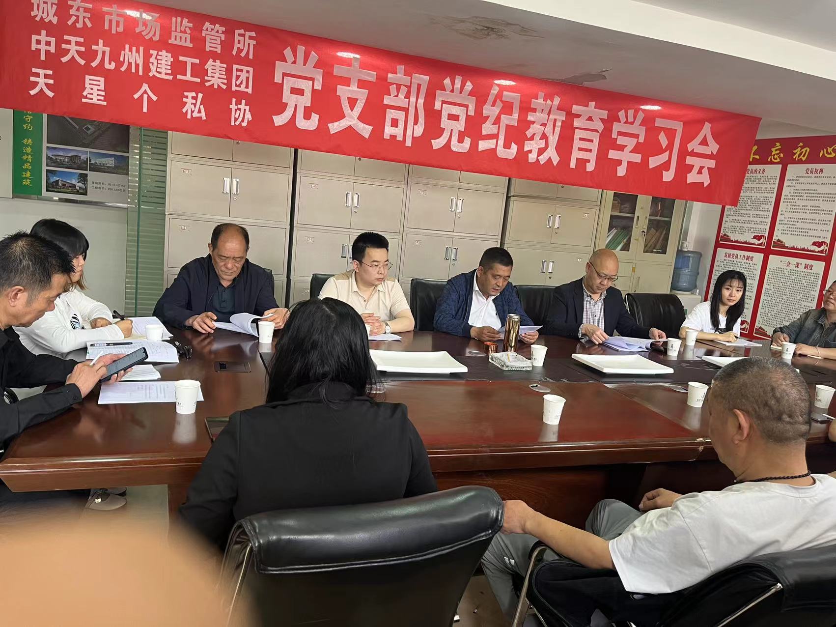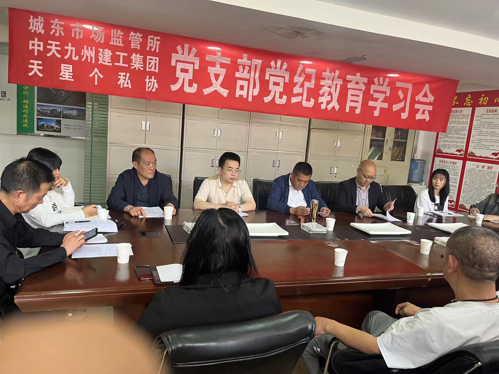 2024年4月25日,城東市場(chǎng)監(jiān)管所、中天九 州 建工集 團(tuán)、天星個(gè)私協(xié)共同組織了黨支部黨紀(jì)教育學(xué)習(xí)會(huì)。